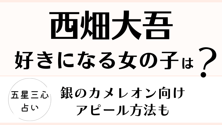 五星三心占いでみると、【銀のカメレオン座/命数43】の西畑大吾さんの好みは、明るくて一緒にいて楽しい女性。